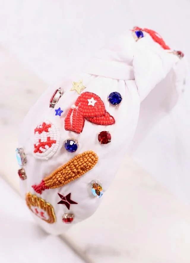 Get ready for the ball game with this beaded embellished headband. It features baseballs, bats, and helmets with accent rhinestones and sequins.